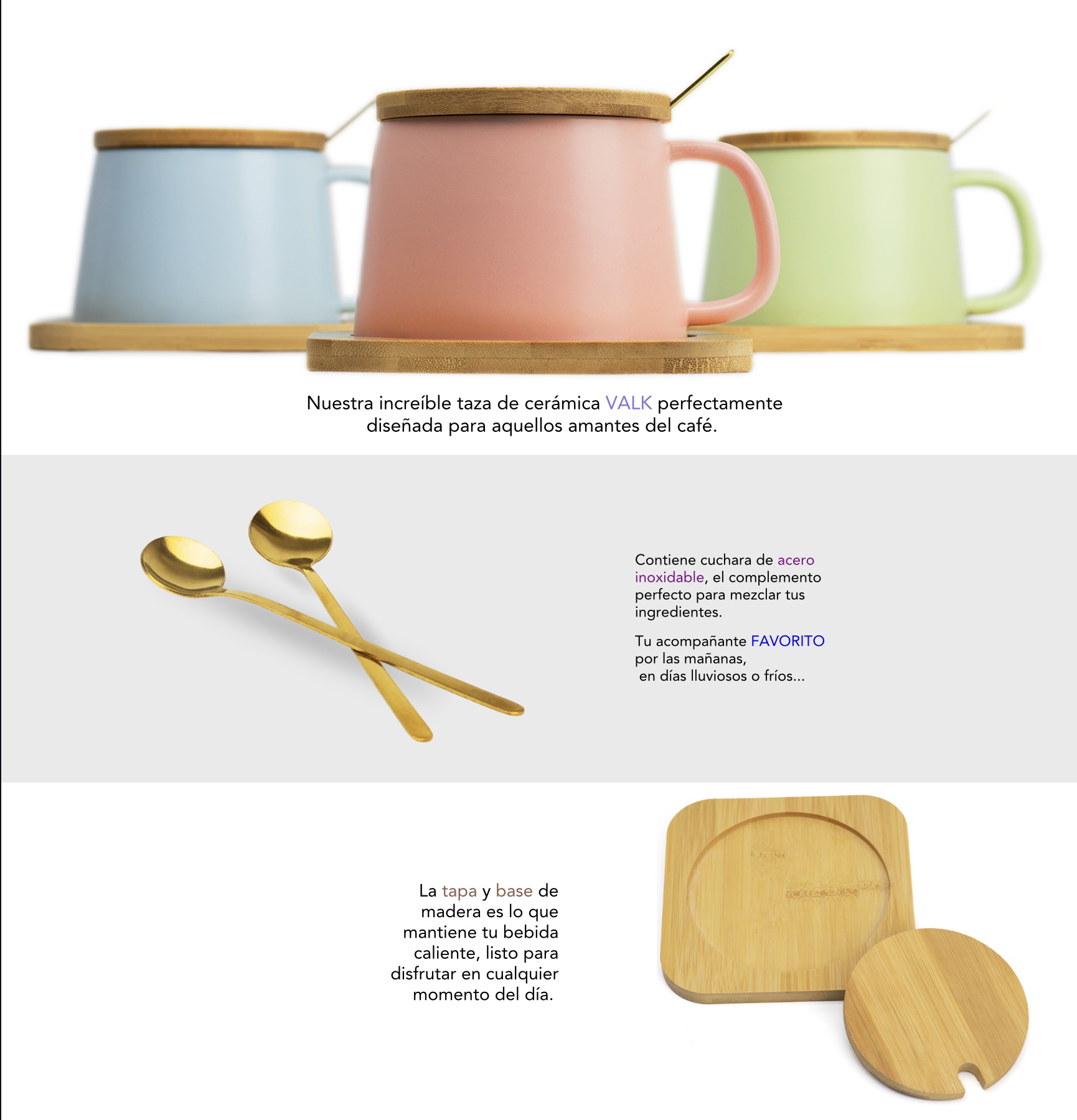 Taza con cuchara de acero inoxidable, tapa y base de madera