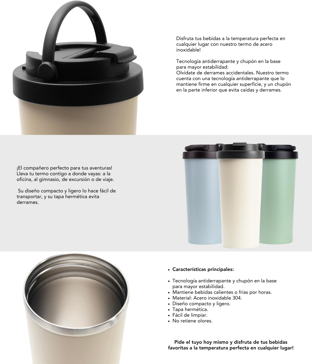 Termo el cual cuenta con tecnología antiderrapante y un chupón en la parte inferior para evitar caídas y derrames, proporcionando estabilidad. Mantiene bebidas calientes o frías por horas